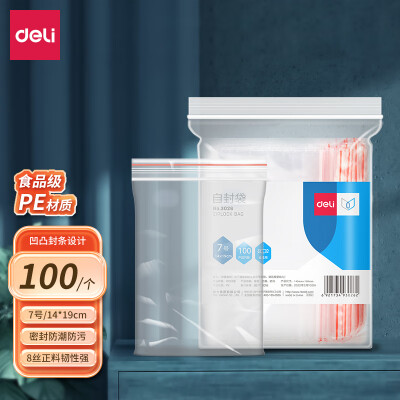 3208 得力(deli)食品密封袋7号20*14cm 加厚防水PE透明收纳防尘 (100只透明/包) 3026 QL003208 ¥12.9 加入询价