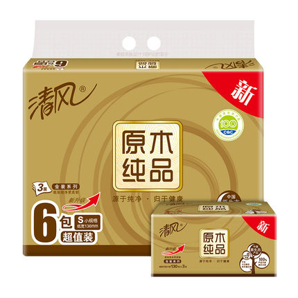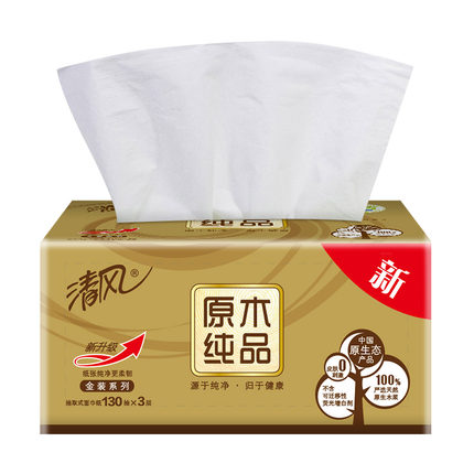 清风BR65SJ1三层原木纯品金装塑包面纸-130抽 206*124mm,3层