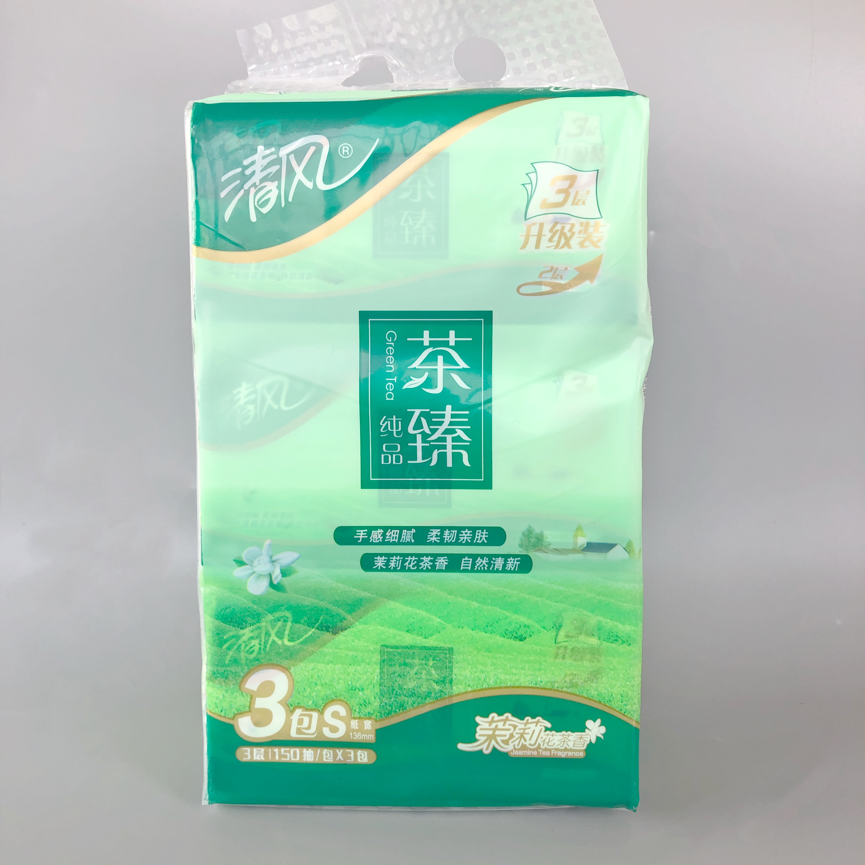 清风BR36SGZ三层小绿茶茶臻丝宠塑包面纸(小机台)-150抽 178*136mm,3层