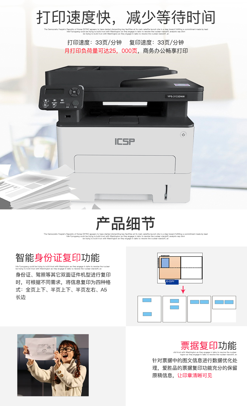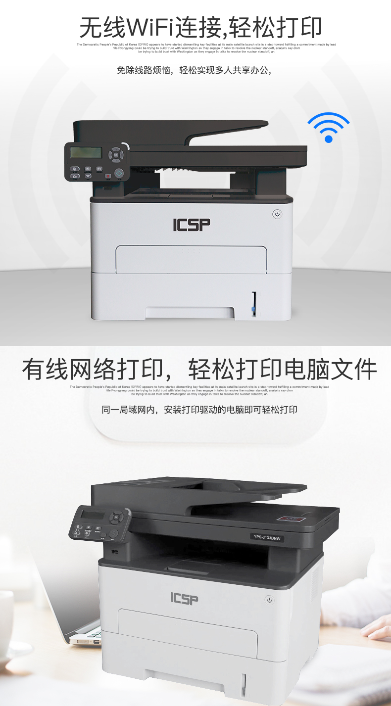 ICSP 爱胜品YPS-3133DNW黑白激光多功能双面一体机 自动双面打印 WIFI网络打印