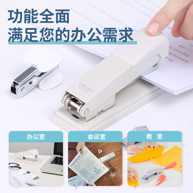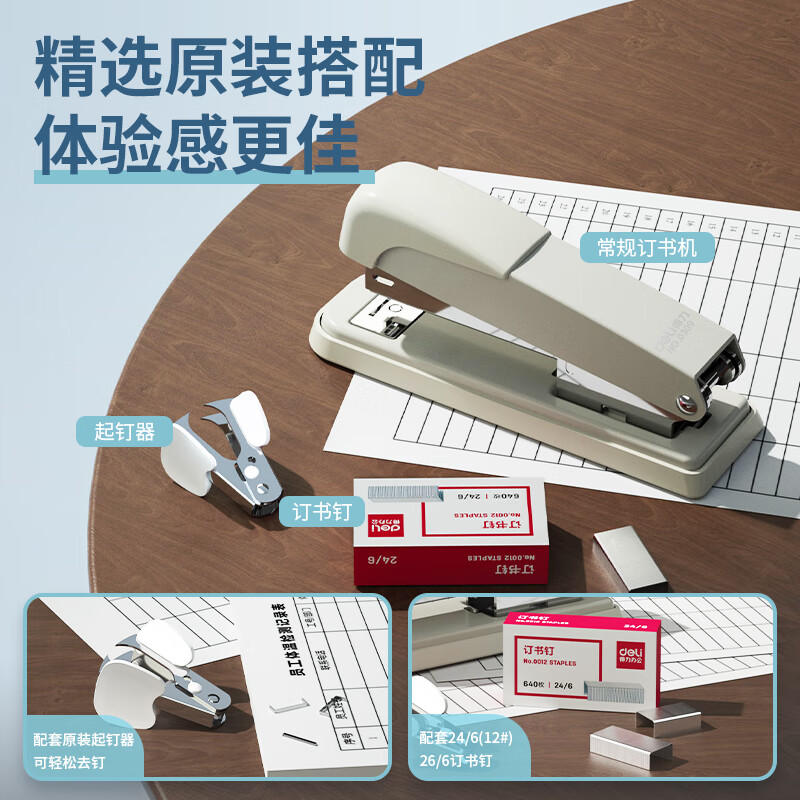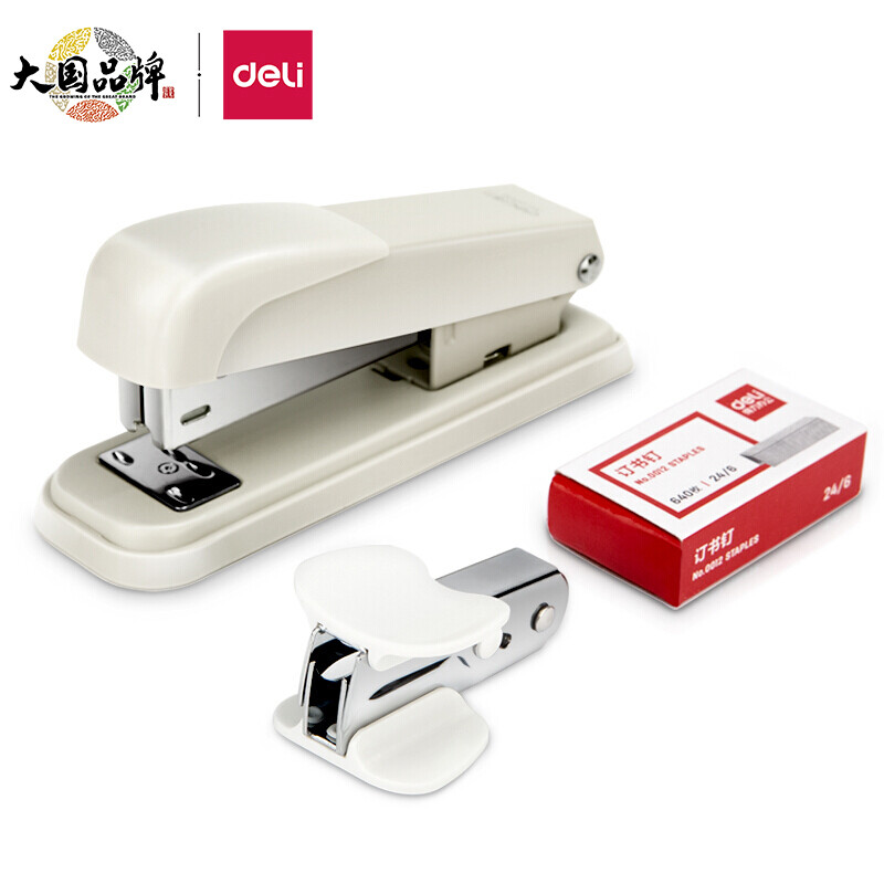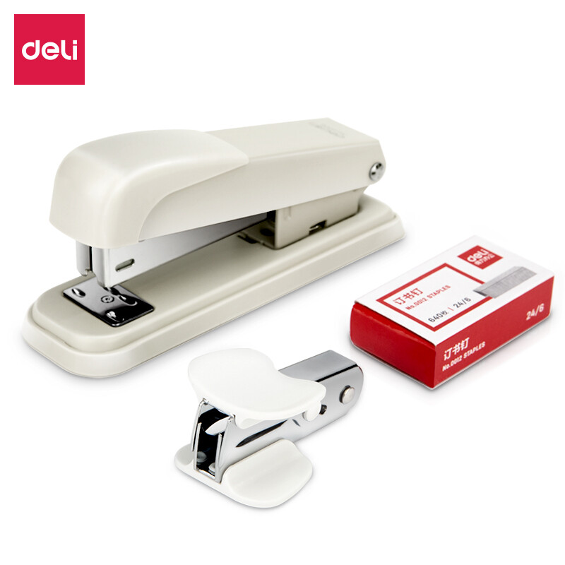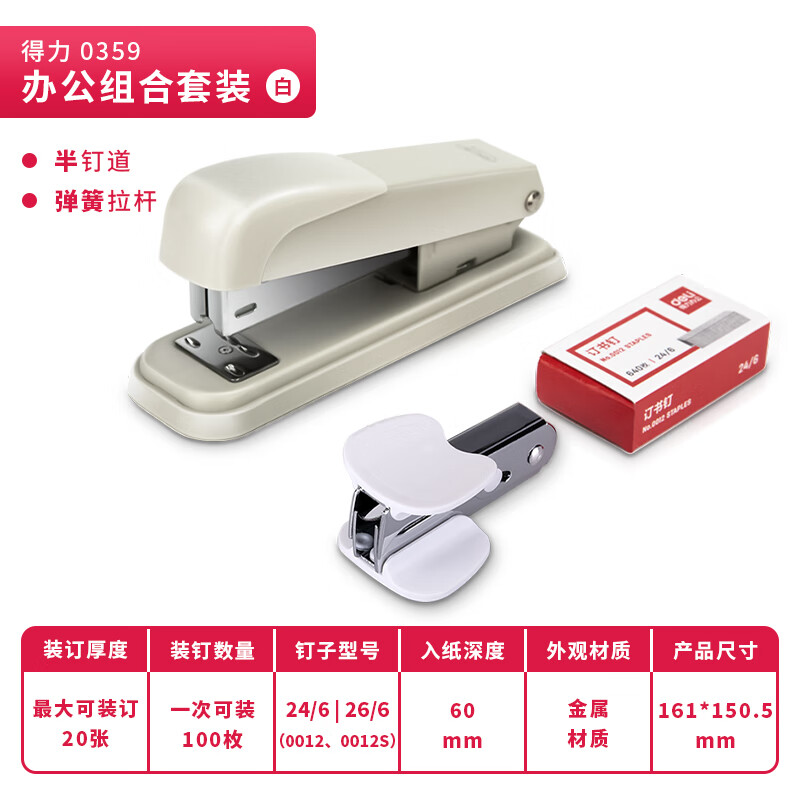 得力(deli)订书机三件组合套装(订书机+订书钉+起钉器) 订书器 白色0359