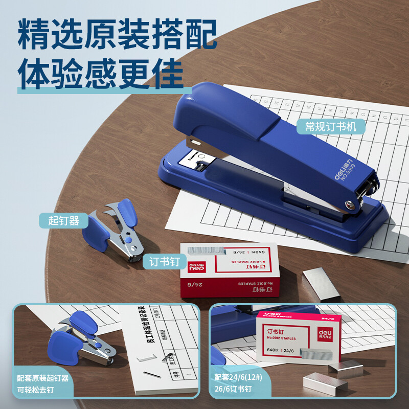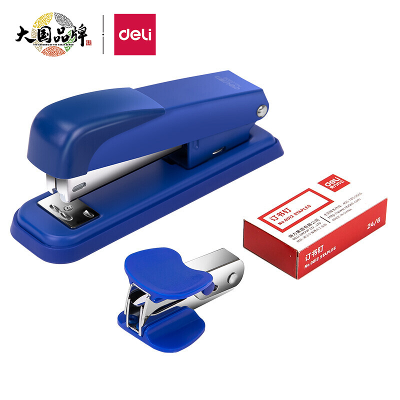 得力(deli)订书机三件组合套装(订书机+订书钉+起钉器) 订书器 蓝色0359