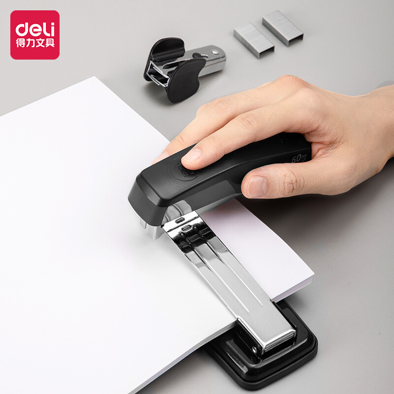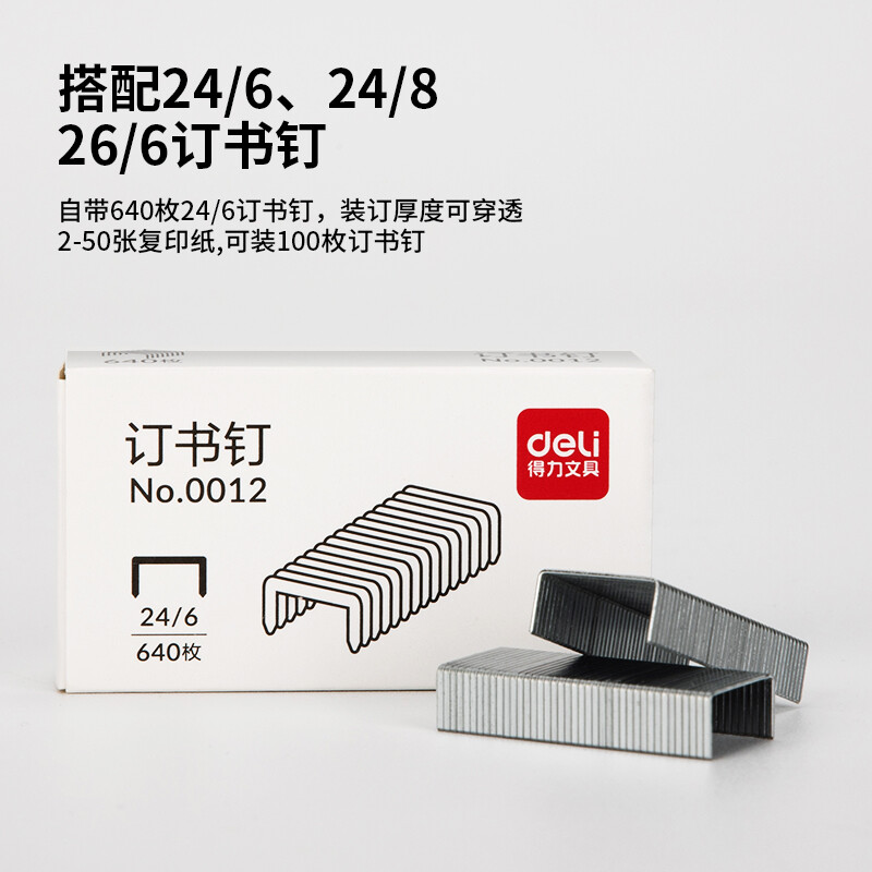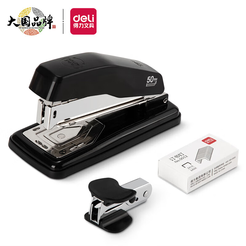 得力(deli)12#旋转订书机套装(起订器+订书钉+订书机)三合一办公用品 黑0418
