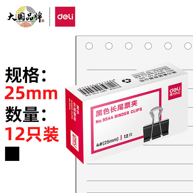 得力(deli)25mm中号金属黑色长尾夹/票据夹/燕尾夹/铁夹子/文件夹子 12只/盒