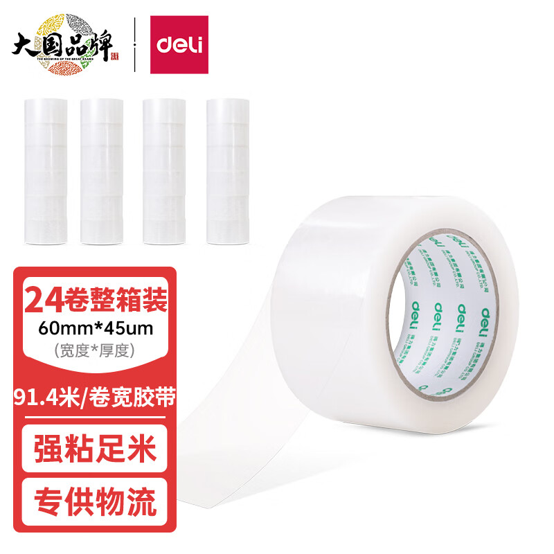得力(deli)高品质高透明封箱胶带打包胶带 60mm*100y*45um(91.4m/卷) 24卷/箱 办公用品 33301