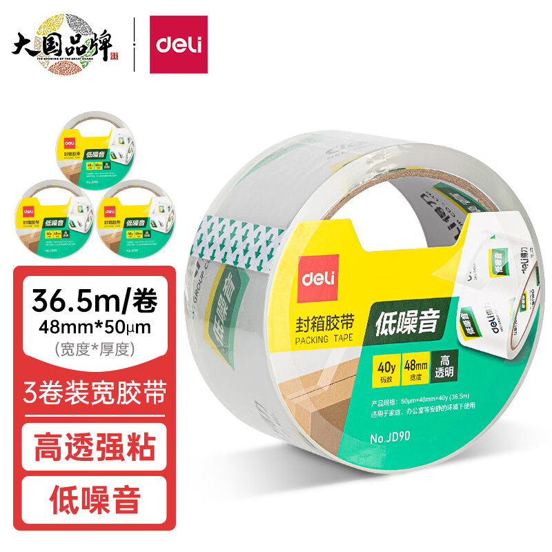 得力(deli)低噪音封箱胶带/打包胶带 48mm*40y*50μm(36.57m) 3卷装 办公用品 JD90