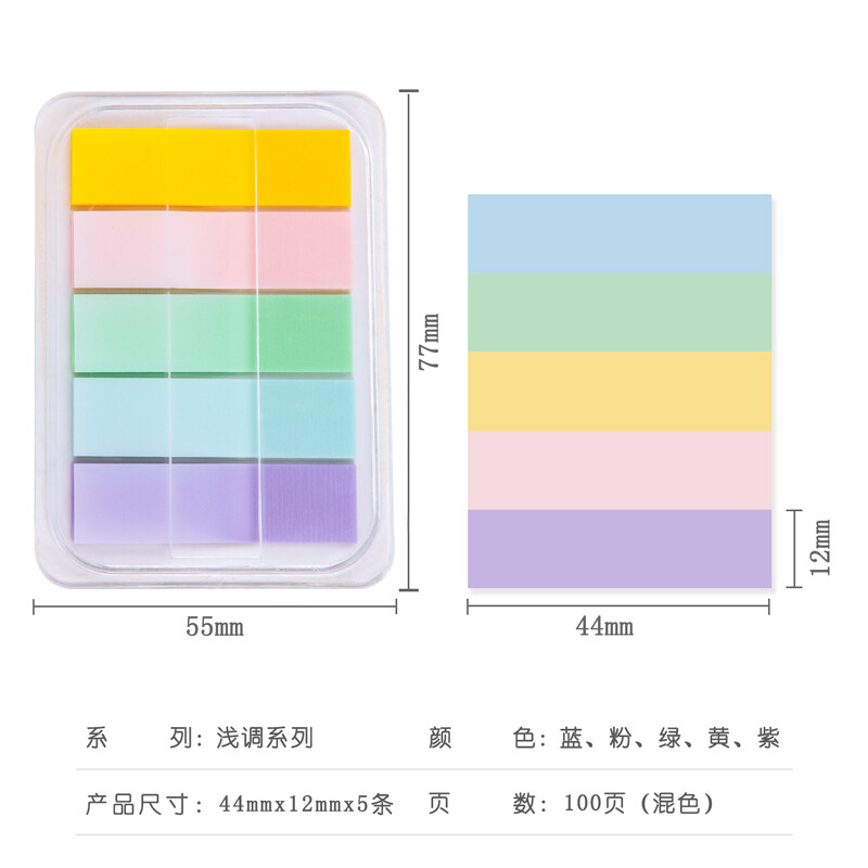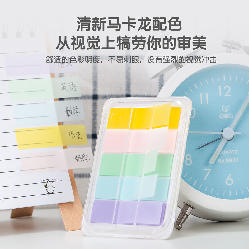 得力(deli)100张5色浅调系列淡彩荧光膜指示标签贴 44*12mm抽取式便利贴便签条记事贴 21606