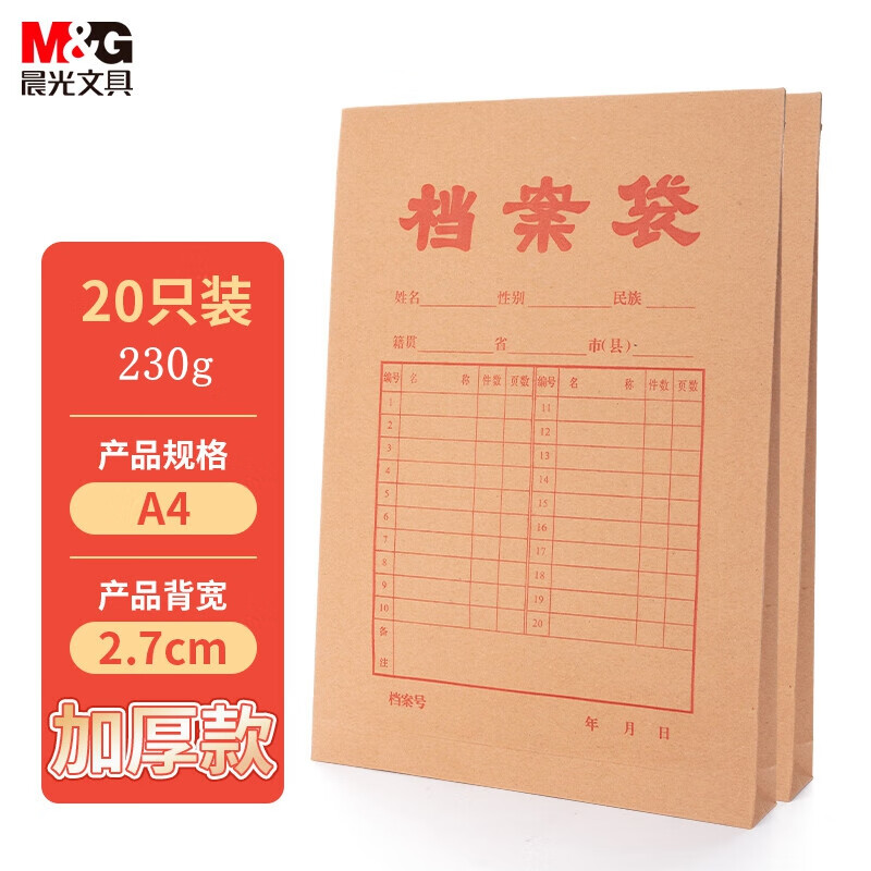 晨光(M&G)文具20个装A4/2.7cm加厚款牛皮纸档案袋 文件袋资料袋 标书合同文件整理收纳袋APYRAB14