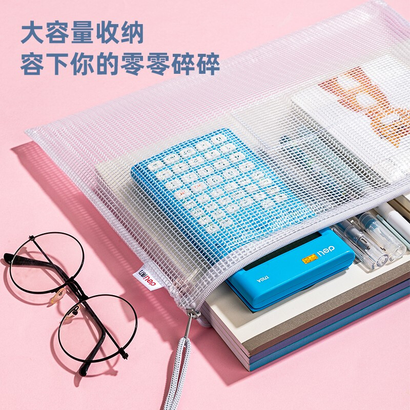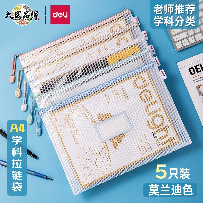得力(deli)透明文件袋 透明网格学科分类袋 学生试卷科目分类文具袋 莫兰迪A4插袋拉链袋5个