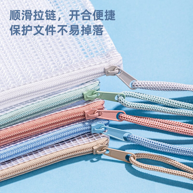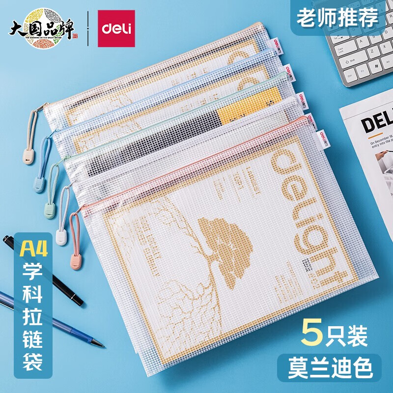 得力(deli)透明文件袋 透明网格学科分类袋 学生试卷科目分类文具袋 莫兰迪A4无袋拉链袋5个