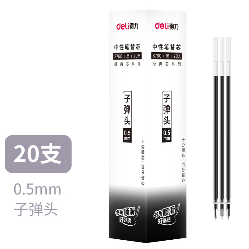得力S760中性笔芯直拔式可替换替芯0.5mm子弹头性笔水笔芯黑笔替芯 【S760黑色/20支+6600es】