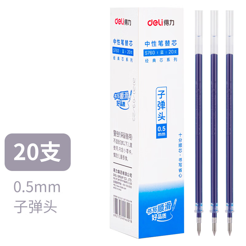 得力S760中性笔芯直拔式可替换替芯0.5mm子弹头性笔水笔芯黑笔替芯 【S760蓝色/20支+6600es】