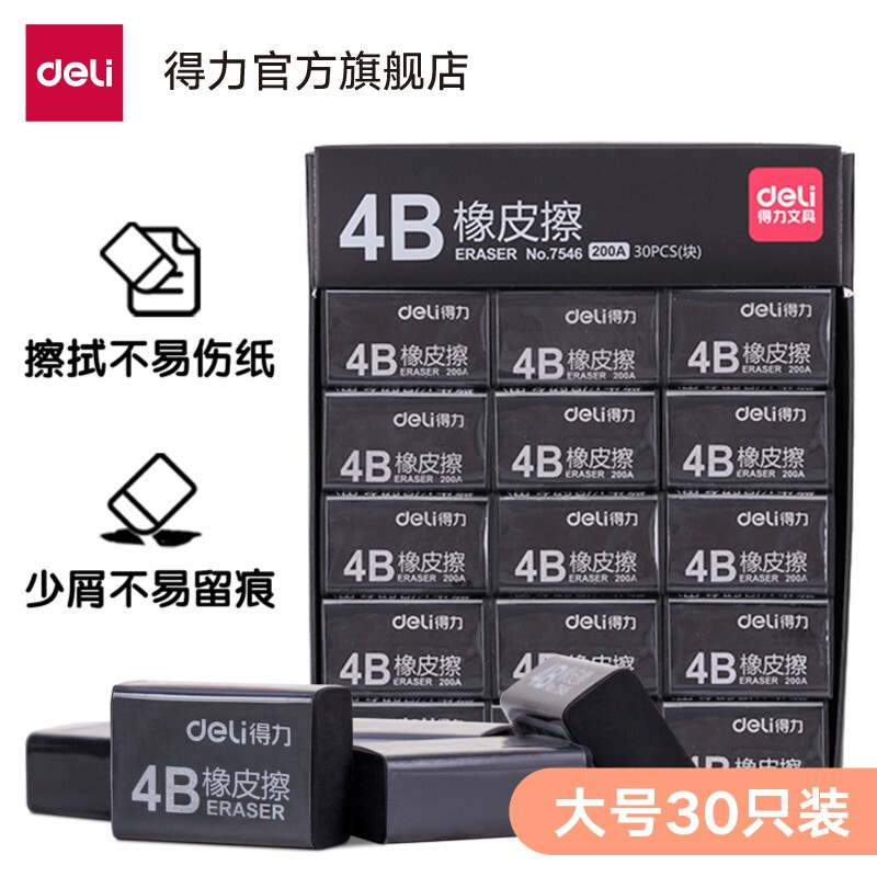 得力(deli)学生橡皮擦 彩色橡皮 学生考试绘图美术橡皮擦 学生用品 居家学习用品 开学推荐 7546(4B)黑色大号 30块