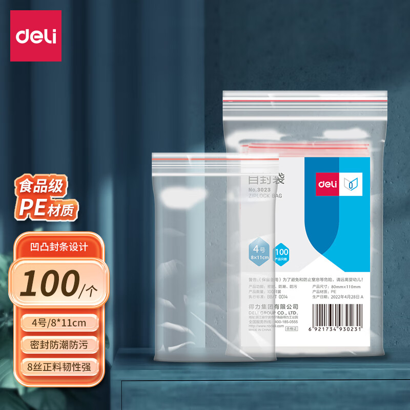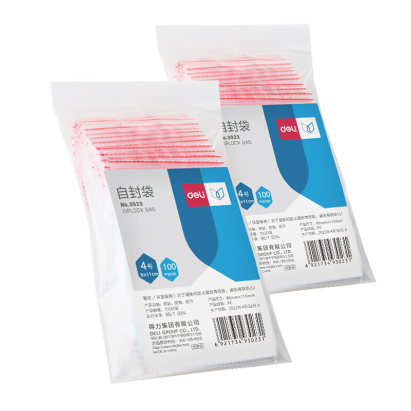 得力(deli)食品密封袋4号12*8cm 加厚防水PE透明收纳防尘(100只透明/包)3023