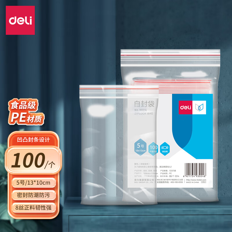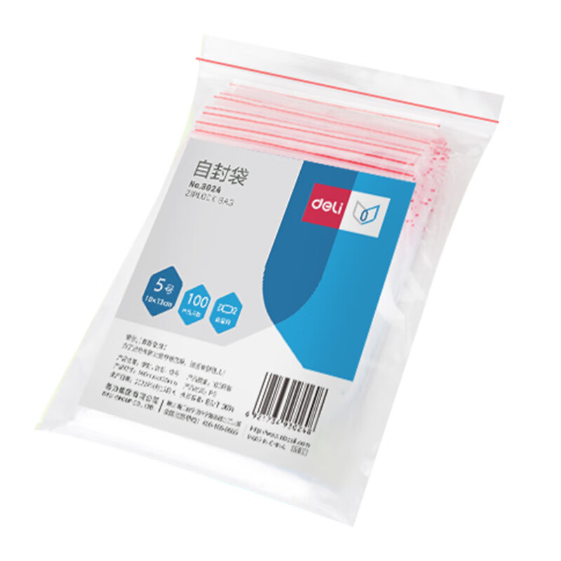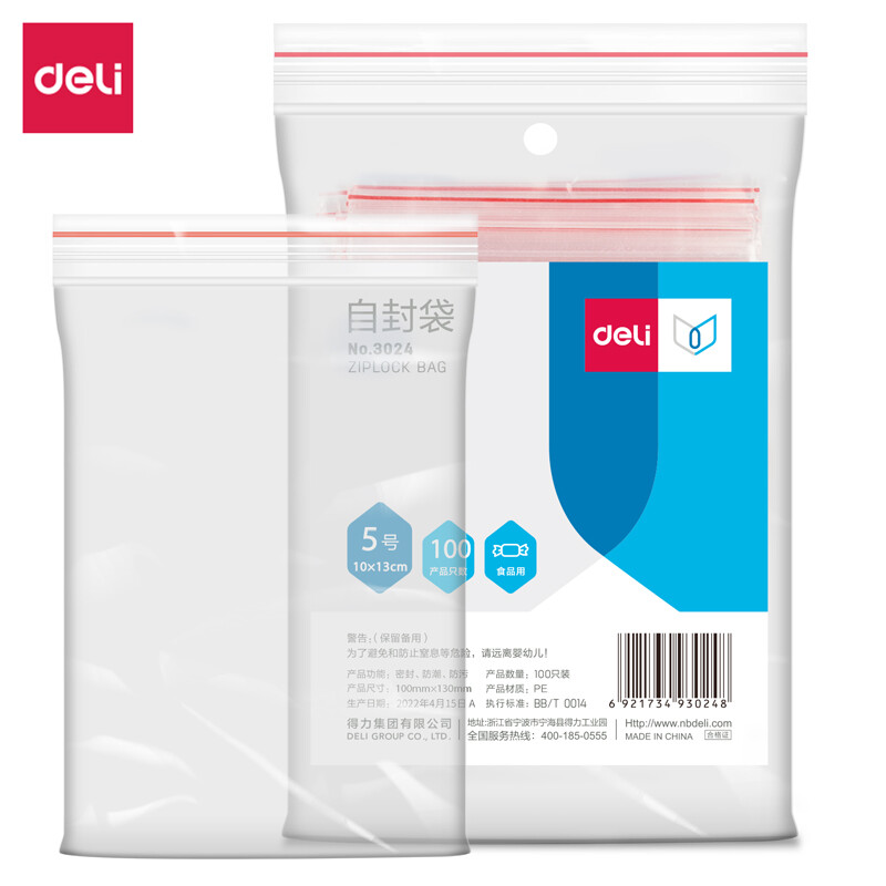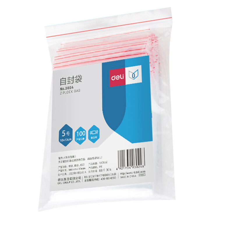 得力(deli)食品密封袋5号13*10cm 加厚防水PE透明收纳防尘 (100只透明/包) 3024