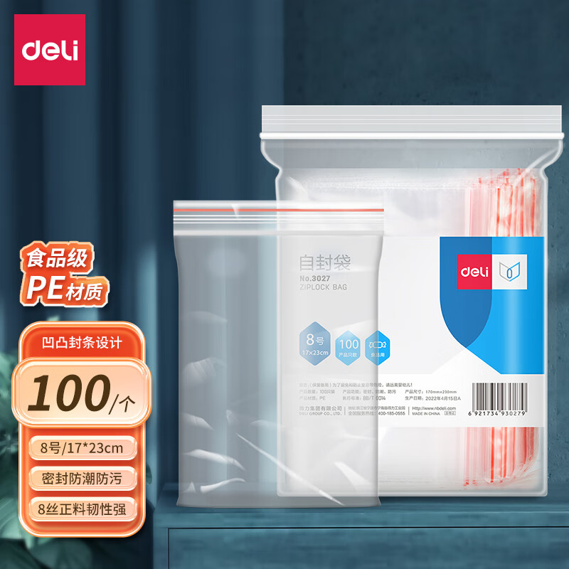 得力(deli)食品密封袋8号24*17cm 加厚防水PE透明收纳(100只透明/包)3027