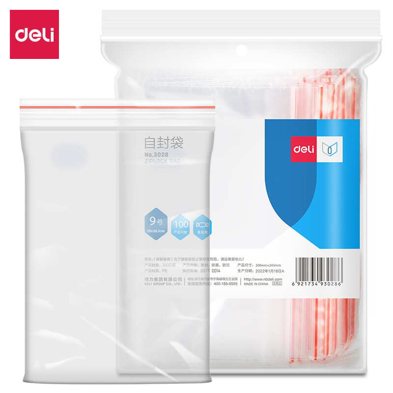得力(deli)食品密封袋9号28*20cm 加厚防水PE透明收纳防尘 (100只透明/包) 3028