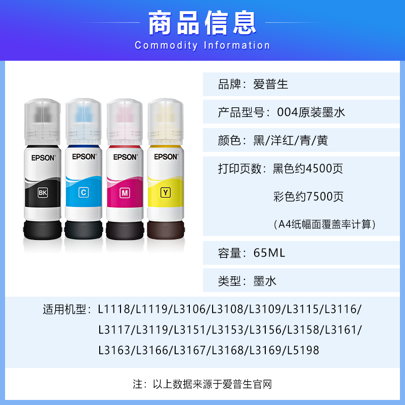 爱普生004系列 墨水四只装(1黑3彩色) 原装 墨水