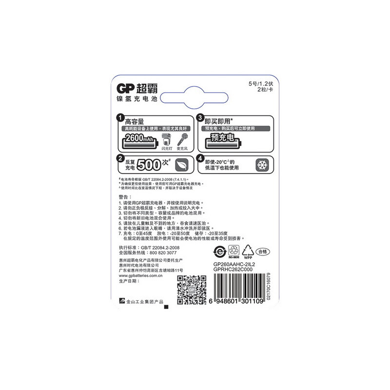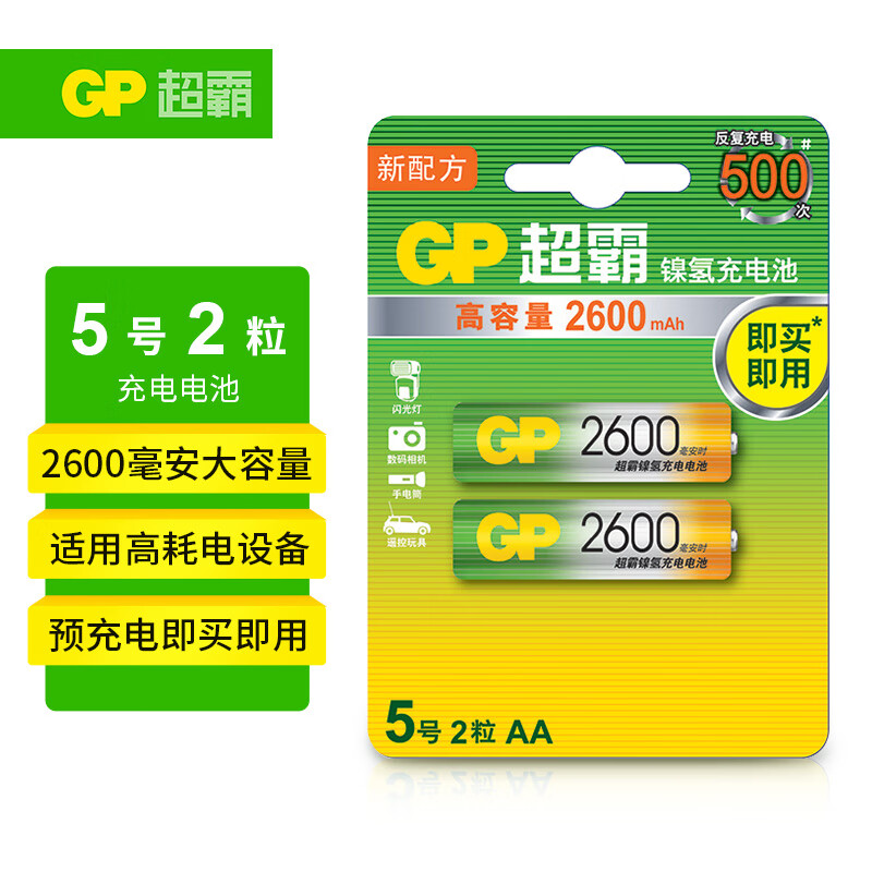 超霸(GP)充电电池5号2粒2600mAh镍氢电池 5号/AA