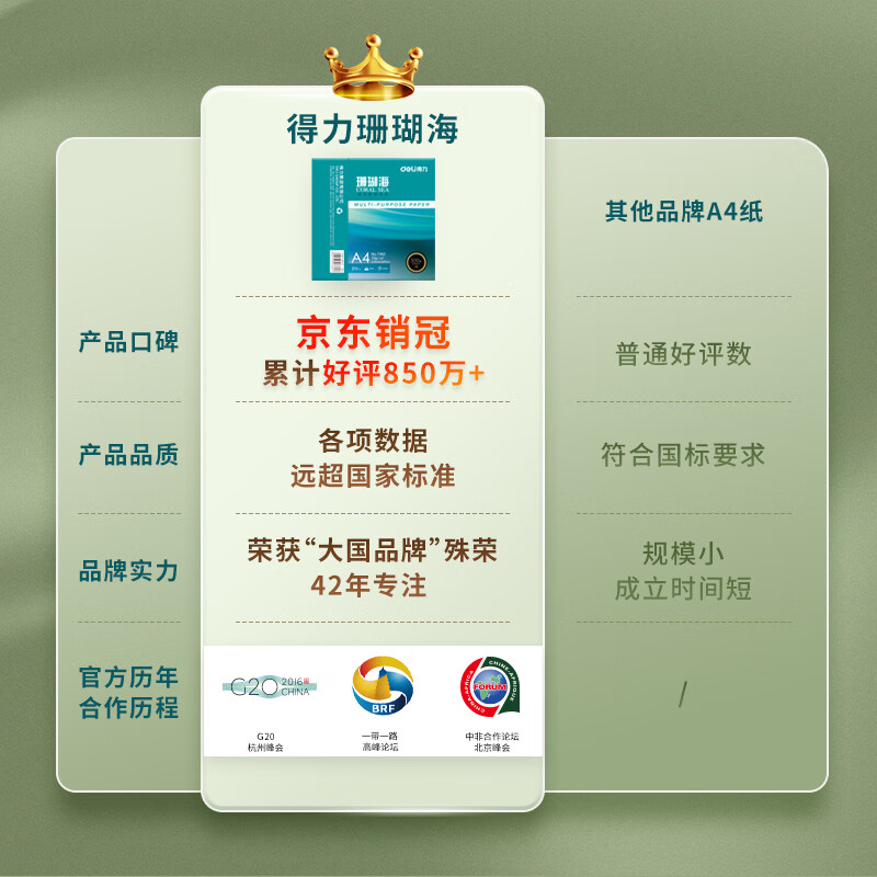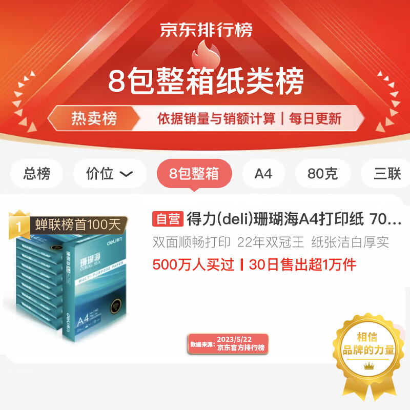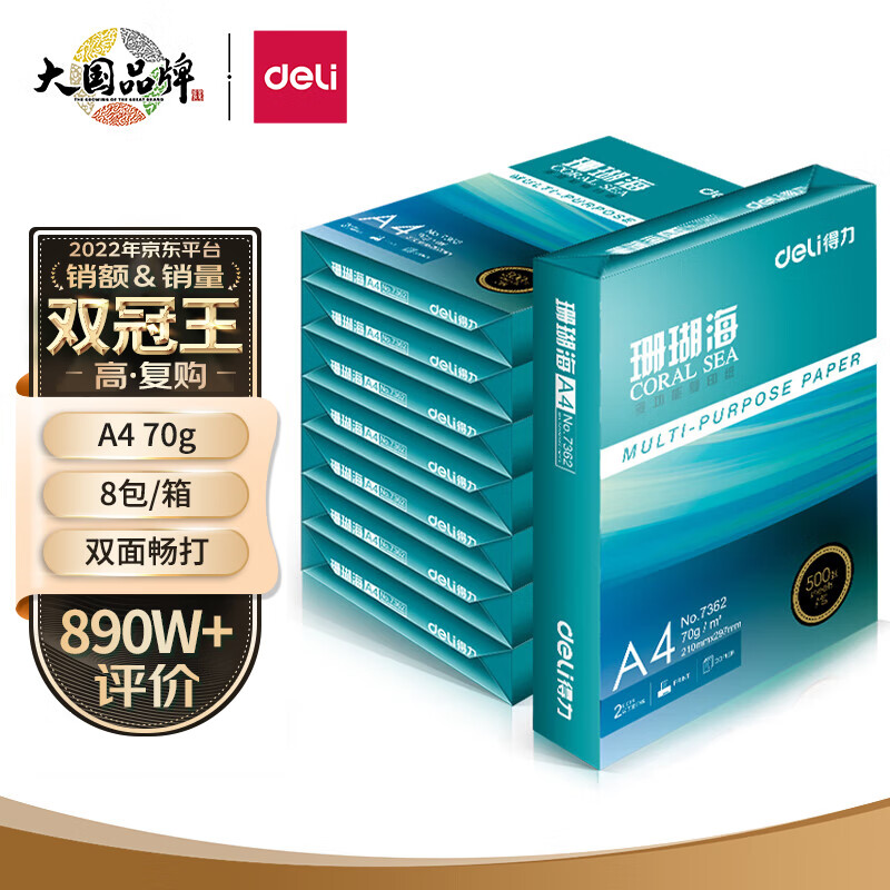 得力(deli)珊瑚海A4打印纸 70g克500张*8包一箱 销冠复印纸 双面草稿纸 整箱4000张 7360