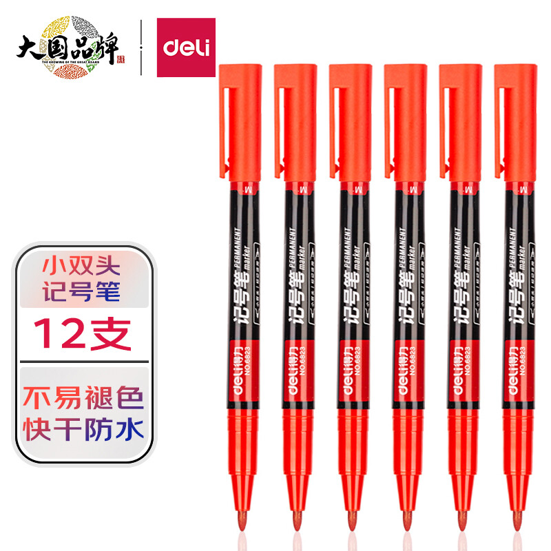 得力(deli) 小双头多用记号笔签字笔 勾线笔会议笔马克笔 双头勾线笔儿童学生 12支/盒 红色 6823