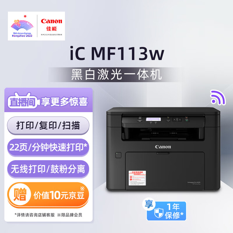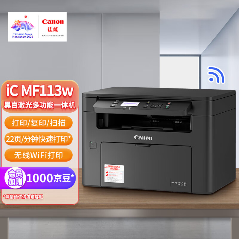 佳能(Canon)ic MF113w A4幅面无线黑白激光多功能一体机(打印/复印/扫描/鼓粉分离 家用/商用)